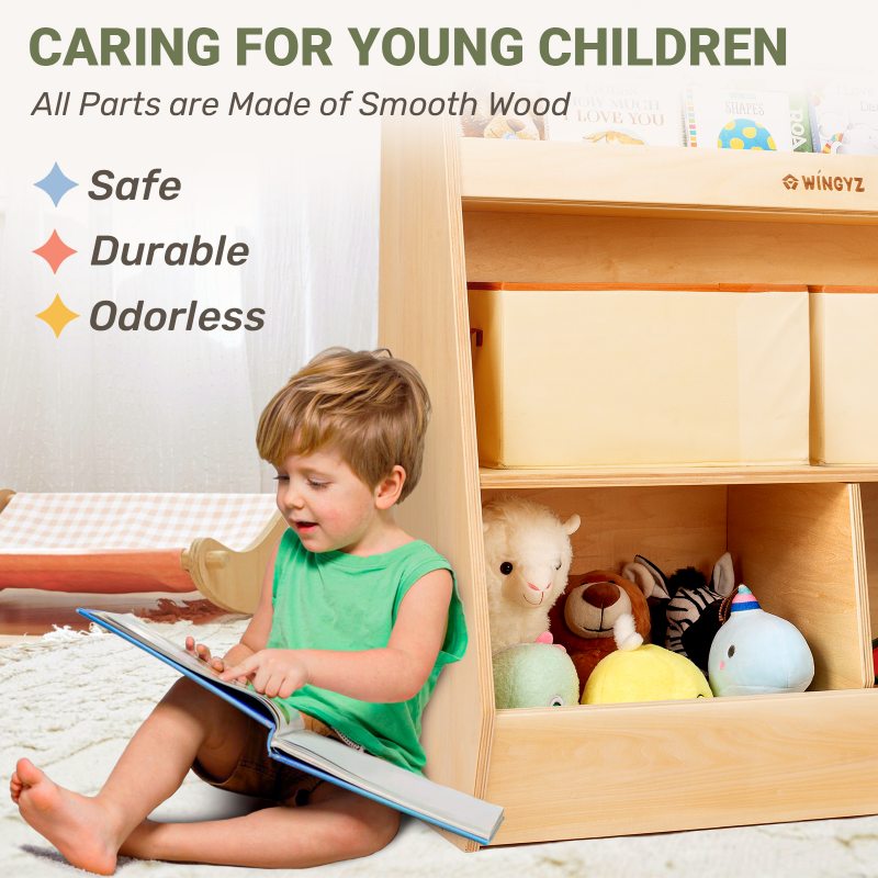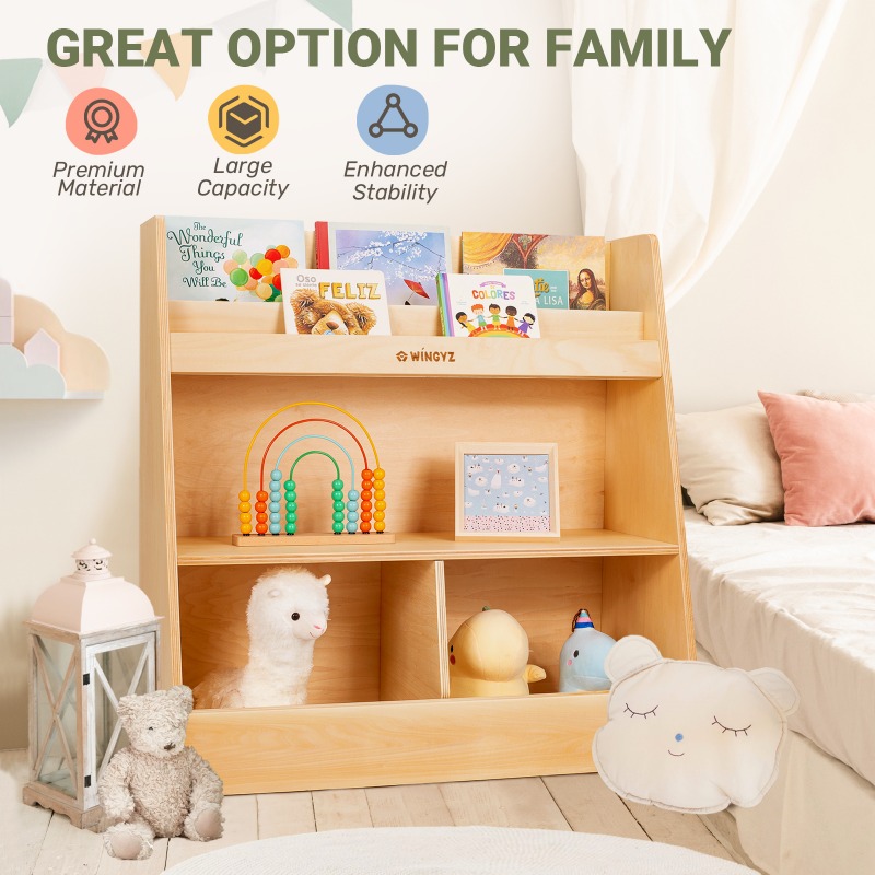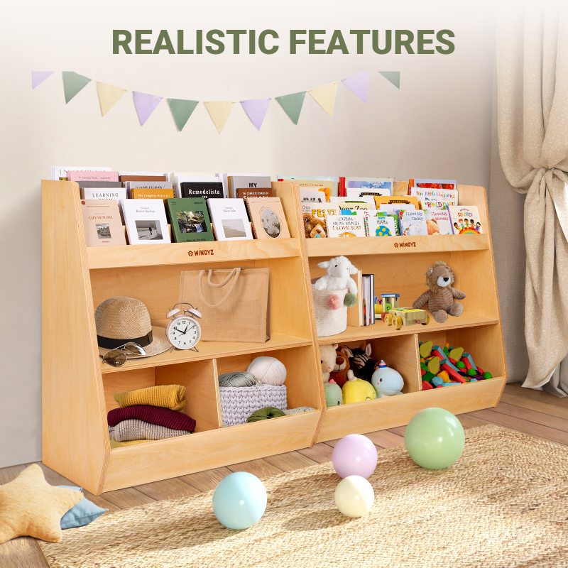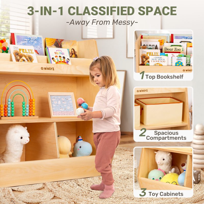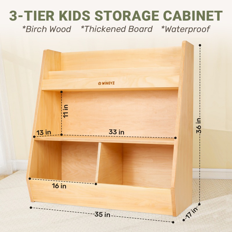 [Multifunctional Storage] This 3-tier cabinet includes a 2-row bookshelf, a spacious middle compartment, and two bottom toy cabinets. Perfect for toddlers and kids, it features versatile shelves and compartments.