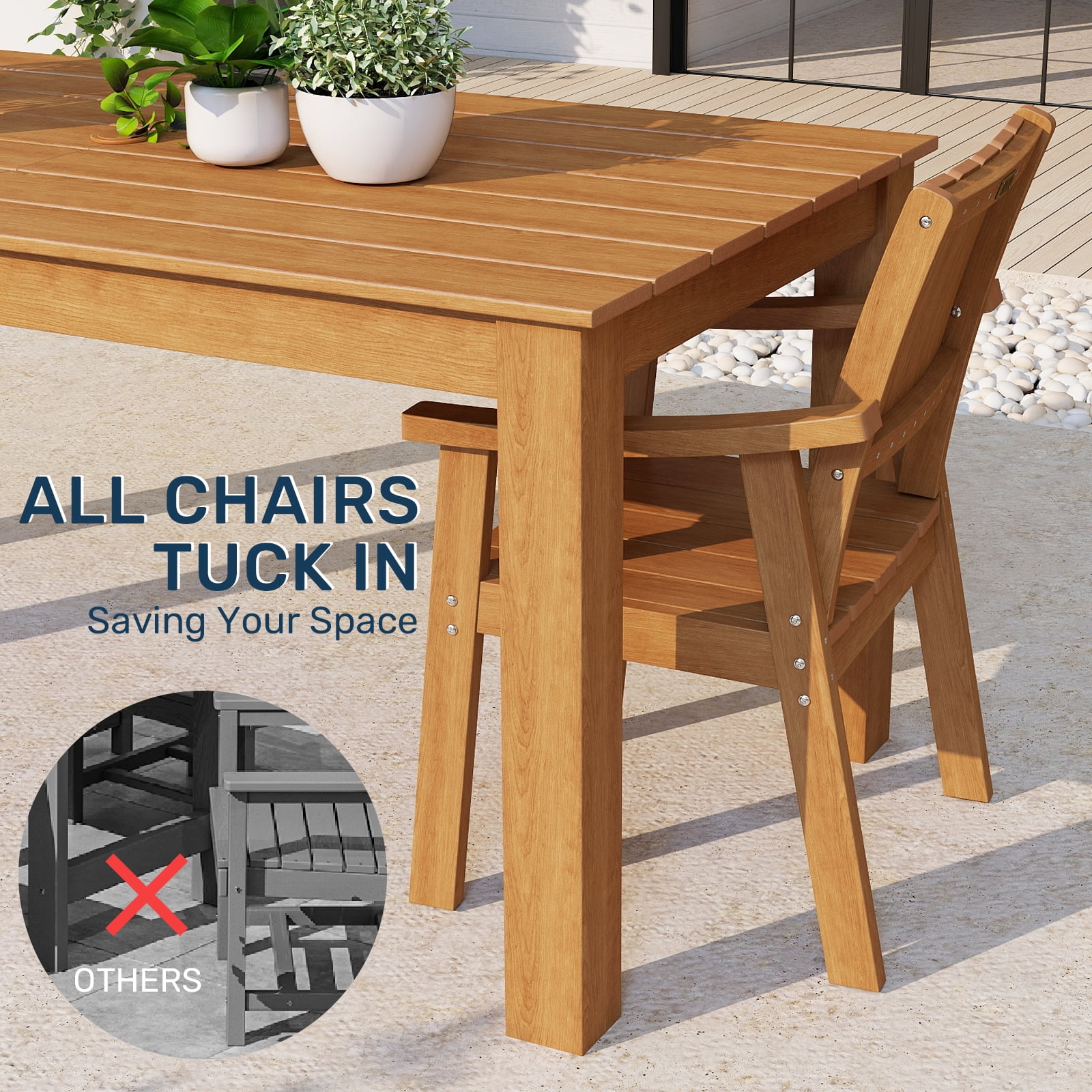 【Spacious Dining Table with Umbrella holes】The patio dining table is designed with a umbrella hole, allows you to add shade during sunny days. The outdoor table is measured 66.9"D*32.3"W*29.1"H, which can holds up to 220LBS, providing enough room to accommodate meals, drinks, and table decor. 【Comfortable Dining Chairs】This patio dining chair is perfect for your family gathering. Featuring its armrest and slated seat, adding extra comfort to the chairs. Each chair measured 24.6"D*23.4"W*33.6"H, its weight capacity is up to 300LBS. 【Easy Installation】This outdoor dining table set is packaged in 4 different packages and may arrive on different days. Partial installation required. Each conversation patio furniture set includes detailed instructions and all the necessary hardware, enabling you to set up your dining area quickly and hassle-free. Instructional video is provided on our website. (ATTN: Do Not Screw The Screws Tightly Before Finishing). 【All Weather Use】patio dining sets are built to withstand the elements and provide long-lasting performance. The sturdy frames and high-density polyethylene materials ensure durability and reliability, allowing you to enjoy outdoor dining for years to come. 【Low Maintenance】plastic dining table sets required low maintenance. Unlike the Steel dining sets may require rust prevention, patio dining table and chairs are easy to clean with just soap and water, requiring minimal effort to keep them looking fresh. 【Customized Combinations】Consider the size of your family or the number of guests you typically entertain, this patio dining table set can meet your different needs. You can choose the single dining chairs to fit your needs.